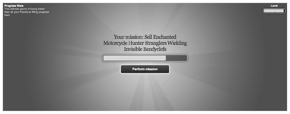 Сейчас прогресс-бары встречаются повсюду. Это один из простейших методов геймификации. Конечно, если он разработан неправильно, то не сможет вовлечь в игру достаточное количество пользователей. Пародийный пример – игра Progress Wars от Якова Скжернинга. По сути своей она бессмысленна: каждый раз, когда вы нажимаете на кнопку, индикатор прогресса заполняется, позволяя пользователям повышать свой уровень (62). Это отличный пример создания игрового дизайна в системе без стимулов, что приводит к низким результатам вовлеченности в игру.