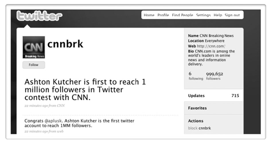 CNN Breaking News, с другой стороны, повели себя спортивно, как и должна крупная компания. На приведенном выше скриншоте можно видеть, что к тому времени, когда Эштон Кутчер выиграл, профиль CNN Breaking News насчитывал 999 652 подписчиков – от победы их отделяли лишь несколько сотен человек. Вместо того чтобы горько сказать: «Так близко! Нас разделяло всего несколько сотен!», они изящно объявили миру: «Эштон Кутчер первым достиг одного миллиона подписчиков в соревновании с CNN в Twitter». И добавили твит с поздравлениями ниже.