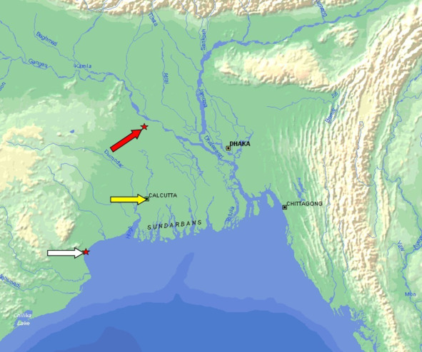 Кассимбазар (красная стрелка), Калькутта (желтая стрелка), Фулта (белая стрелка)