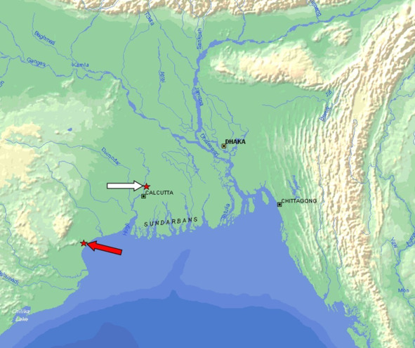 Чандернагор (белая стрелка), Балласор (красная стрелка)