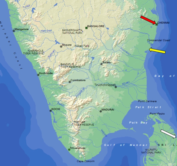 Мадрас (красная стрелка), Пондичерри (желтая стрелка), Триномиале – британская база на Цейлоне (белая стрелка)