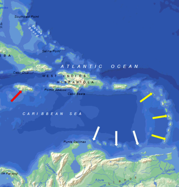 Ямайка (красная стрелка), Подветренные острова (белые стрелки), Наветренные острова (желтые стрелки)