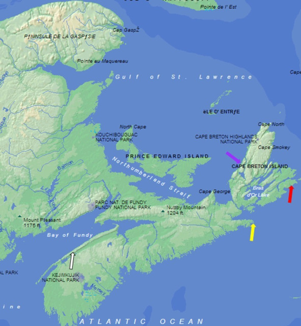 Полуостров Новая Шотландия: остров Кейп-Бретон (сиреневая стрелка), Луисбург (красная стрелка), Кансо (желтая стрелка), Аннаполис-Ройал (белая стрелка)