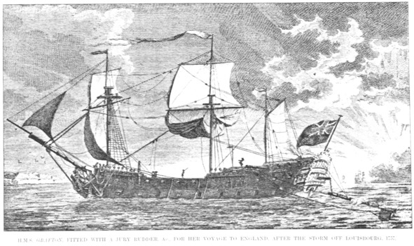 * «Графтон» потерял грот-мачту, верхнюю часть фок-мачты (фор-брам-стеньгу) и руль; но корабль благополучно добрался до Англии, установив временную грот-мачту и импровизированный руль, придуманный коммодором Холмсом.