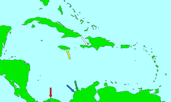 Порт-Ройал (желтая стрелка), Леоган (белая стрелка), Пуэрто-Белло (красная стрелка), Картахена (синяя стрелка), Санта-Марта (зеленая стрелка)