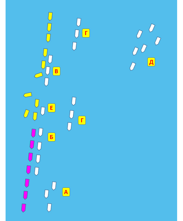Г – большие группы британских кораблей, проигнорировавшие приказ адмирала вступить в бой, ограничившие свое участие бесполезными обстрелами с дальних дистанций