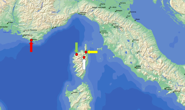 Остров Корсика. Бастия (желтая стрелка), Сан-Лоренцо (белая стрелка), Кальви (зеленая стрелка. Тулон (красная стрелка)