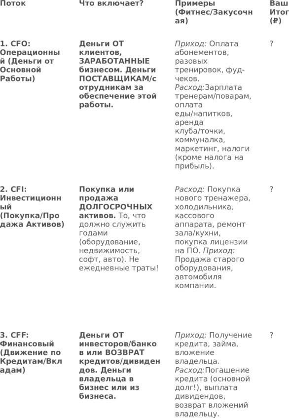 Разделите ВСЕ движения денег на 3 КРИТИЧЕСКИХ ПОТОКА:
