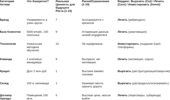 Рецепт: 1. Найти корневую причину краха («Золотой треугольник смерти»: Деньги, Процессы, Идея). 2. Инвентаризировать все «живые ткани» и «шрамы». 3. Присвоить каждому активу/ограничению вердикт.