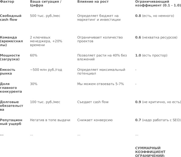 На основе этих данных вы выводите свои целевые метрики. Если ваша мечта была «100 млн выручки», но суммарный коэффициент ограничений 0.8, ваш реалистичный Потолок Роста – 80 млн.
