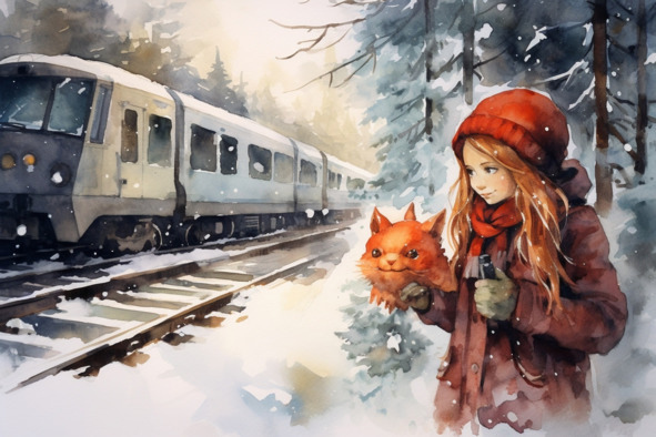 Лиска кивнула и опять девочкой стала. Тит же превратился в рыжего котёнка, повышенной пушистости, и удобно устроился на её руках. Вот так они вдвоём и постучались в купе к путешественнику. Тот и правда оказался добрым человеком. Сразу принял девочку в попутчики. Лиска очень правдоподобно доложила тому, что на поезд она села на последней станции, ещё перед метелью. А сейчас едет на север, в гости к самому Деду Морозу!
