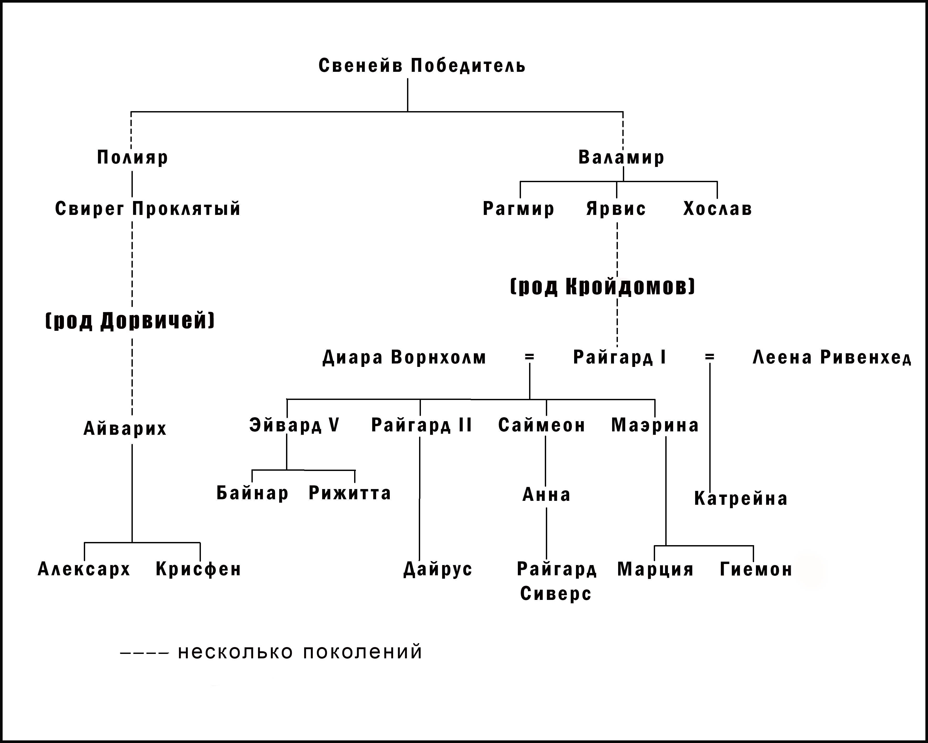 По крайней мере, жизнь теперь наладится, подумала она. У Ноэля есть Рик, Георг собирается жениться, они с Валером войдут в Совет, как и Энгус, который помог взять город почти без боя. Иглсуд после объяснений Георга больше не обвинял Ривенхедов в смерти Тории, зато рьяно проклял Айвариха и отправил сына в королевскую стражу. Представители разных родов спешили поклясться в верности новому монарху. Сколько из них сдержат слово, Самайя не решилась бы предсказать. Баронский титул Орланда перешёл Рику. Многие были этим недовольны даже после того, как Дайрус издал приказ, даровавший племяннику привилегии законного сына, кроме прав на трон. Ривенхеды смотрели на Рика с нескрываемым презрением. По крайней мере, ни один не посмел усомниться, что Рик – потомок Свенейва. О браке с Анной Ноэль промолчал.