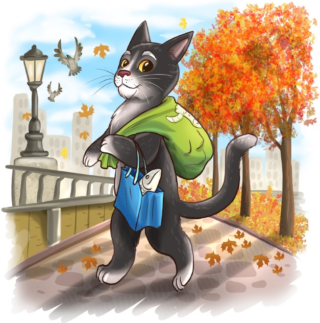 Кот шагает по бульвару,Вдоль канала, по базару.Рыбка у него в пакете,Сливочный пломбир в брикете.Кот пошёл на луг к Корове.У неё всё наготове:Масло, молоко и творог.Кот спешит в автобус «Сорок».Вот домой вернулся Котик.Дома варится компотик.Кошка много успевает,Сытный ужин накрывает.Самовар пыхтит на ножках.Ласково мурлычет Кошка:– Кушай, Котик-Котофейка.Молочка ты в чай подлей-ка.Целый день легко ль трудиться,Чтобы было чем кормиться?Кот, мурлыча, отвечает:– Эту тайну каждый знает:Всё для вас, мои котята,Творог, молоко, цыплята…Кот шагает вдоль базара,По мосту и вдоль бульвара.Рано утром он поднялся,За работу сразу взялся,Чтоб семейство было сытым,В изобилье стол накрытым.Голод незнаком тем будет,Кто трудиться не забудет!