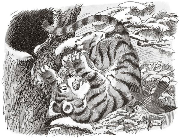 Стал тигрёнок играть со снегом. Подбросит снег лапой, а потом снежинки ловит. Играл-играл – надоело.