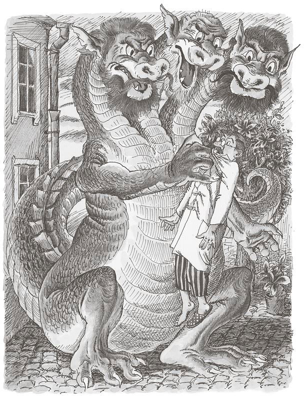 А потом вот что произошло. Дракон тоже завернул за угол и увидел, что перед ним три переулка. Очень узеньких. И тут Лысая голова побежала прямо, Усатая повернула направо, а Рыжая – налево. А переулки были такими узкими, что в них приходилось протискиваться. И вот все три головы протиснулись в разные переулки, а тело-то осталось позади. Вот такая получилась история! Застрял Дракон. Дёргает своими головами, а ничего не выходит. Вперёд головы лезут, а назад – ни в какую. Уши мешают!