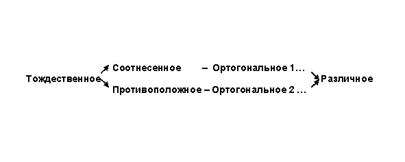 Благодаря понятию «ортогональное» можно осмысливать не только все ритмы природы, например, что представляет собой движение механического и электромагнитного маятников, движение космических тел по орбитам, что такое температура, звук, свет. Но главное, мы можем понять и обмены в обществе. Причем, все сравнительные понятия выстраиваются так, что каждое менее сложное понятие представляет собой частный случай (вырожденное состояние) более сложного понятия. Например, «Соотнесенное» и «Противоположное» представляют собой вырожденное состояние понятий «Ортогональное 1 Пифагора» и «Ортогональное 2 Гераклита». А понятие «Тождественное» – это вырожденное состояние «Соотнесенного» и «Противоположного». При этом точки на схеме обозначают другие, не показанные на ней, более сложные сравнительные понятия.