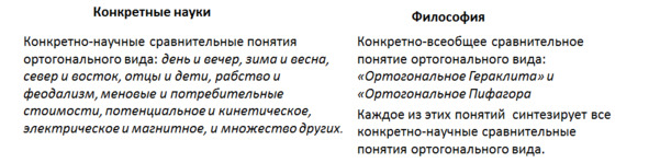 Продолжая дело древнегреческих мыслителей, мы собираем выявленные ими конкретно-всеобщие сравнительные понятия и объединяем их в единую систему. Так, у Пифагора мы находим его знаменитую теорему, связывающую под прямым углом две градации (Ортогональное 1 Пифагора). Тогда как у Гераклита мы находим гармонию лука и лиры (Ортогональное 2 Гераклита), связывающую под углом 90 градусов две пары противоположностей.