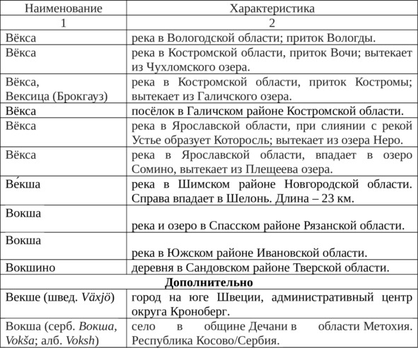 Таблица В6Гидронимы и топонимы Вёкса (Векша, Вокша) на территории России