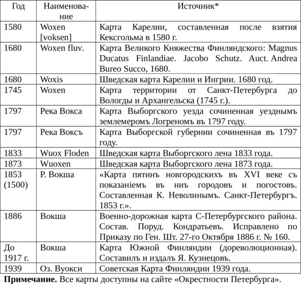 Таблица В7Названия реки Вуокса на картах XVI—XX вв.