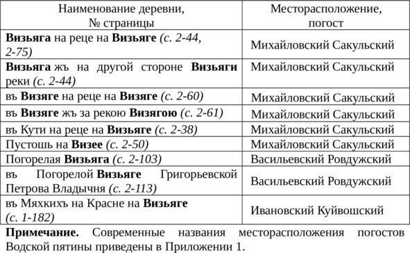 Таблица В8Гидронимы и топонимы Визьяга/Визяга по «Переписной книге Водской пятины 1500 года»