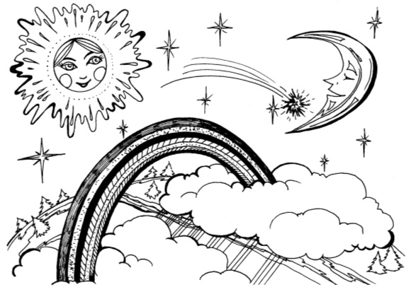 (Небо, звезды, месяц.)Разостлана постилка, на постилке серебряный песочек, а посередине золотой кружочек.