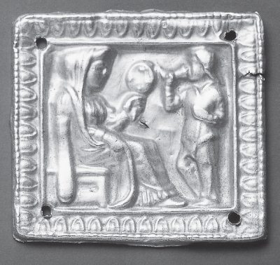 Илл. 11. Золотая бляха с богиней, сидящей на троне с зеркалом в руке и пьющим из ритона скифом. Курган Чертомлык, IV в. до. н. э.