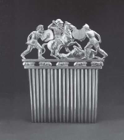 Илл. 14. Золотой гребень с батальной сценой. Курган Солоха, конец V–IV вв. до н. э.