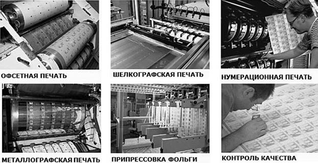 Итак, процесс производства банкнот является очень сложным и высокотехнологичным. Практически на всех этапах процесса, начиная с изготовления бумаги, в банкноту вводятся разнообразные защитные признаки, существенно затрудняющие ее фальсификацию, о чем более подробно будет сказано ниже. Особенно сложным и наиболее насыщенным с точки зрения применения высоких технологий, разнообразных видов красок и способов печати является современное печатное производство (рис. 1.1.10).