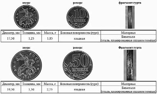 Внешний вид и характеристики этой новой разновидности монет Банка России номиналами 10 и 50 коп. образца 1997 г. показаны на рис. 1.1.13.