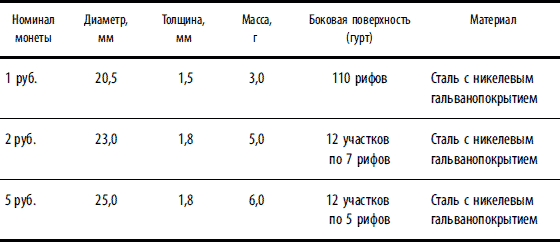 Таблица 1.1.3. Основные характеристики и параметры монет Банка России