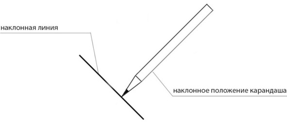 Чтобы нарисовать наклонную линию, карандаш надо держать под углом, как показано на рисунке.
