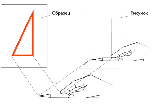 Вытяните абсолютно прямую руку по направлению к расположенному перед вами треугольнику, держа карандаш горизонтально во фронтальной относительно себя плоскости двумя пальцами (большим и безымянным). Совместите конец карандаша с левой крайней точкой меньшего катета. Указательным пальцем отметьте крайнюю правую точку этого же катета.