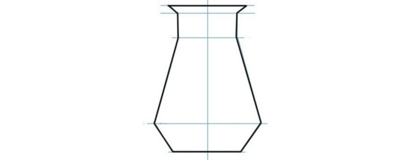 Посередине листа проведите вертикальную прямую – ось симметрии и горизонтальные прямые в месте перехода одной поверхности в другую. Наклонными или вертикальными линиями обозначьте образующие каждой части. Справа и слева от осевой линии расстояния на горизонталях должны быть одинаковыми. Если они будут разными, предмет получится асимметричным. Это является ошибкой.