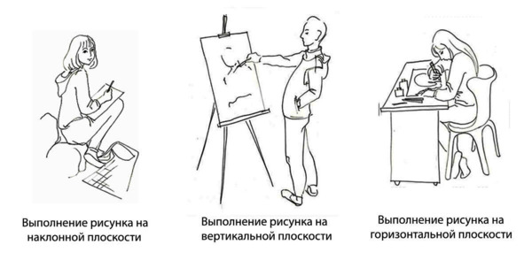 В изобразительной практике существует три способа ведения рисунка: на горизонтальной, вертикальной и наклонной плоскостях. От способа рисования зависит техника работы карандашом, что сказывается на характере используемых технических приемов.