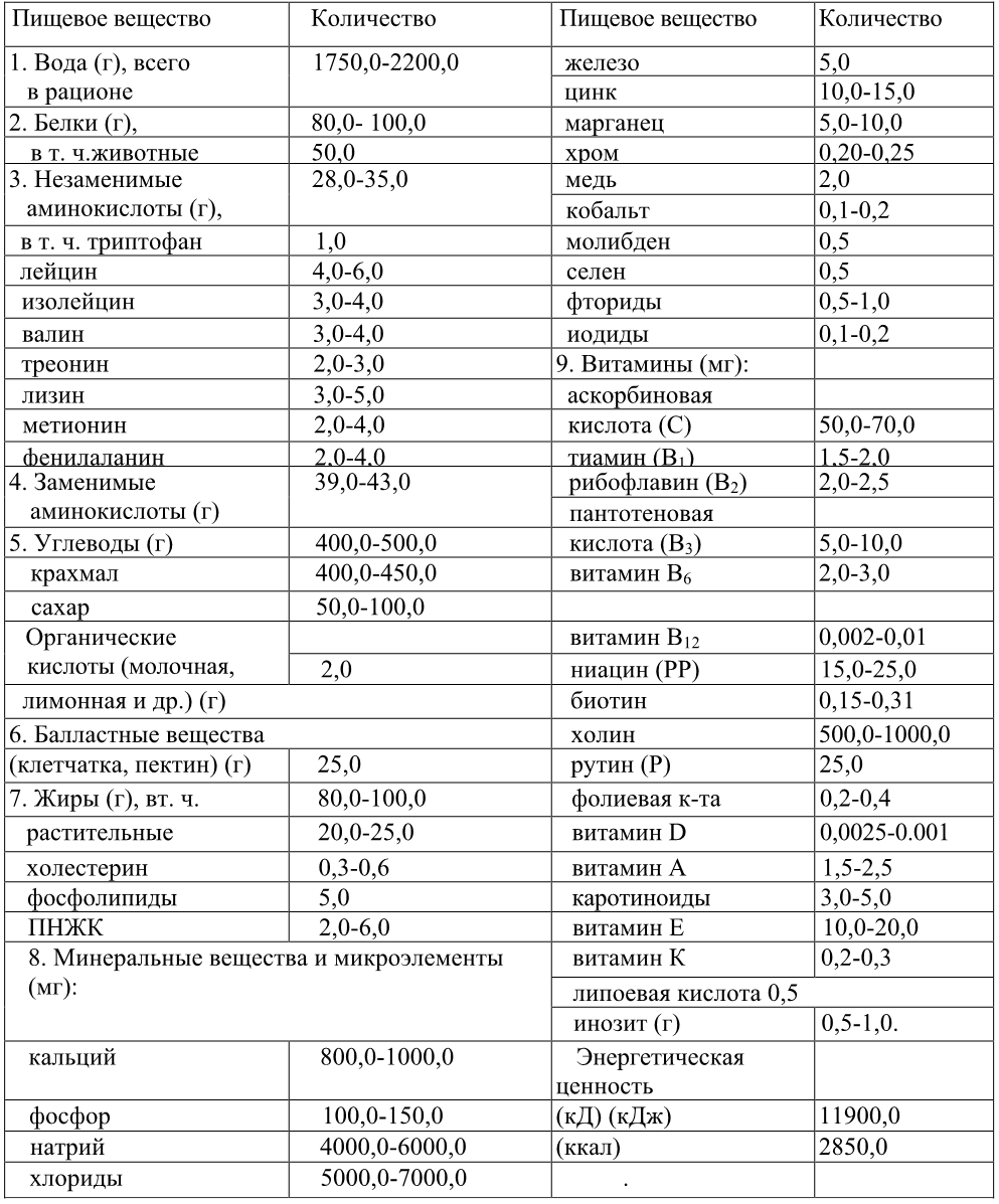 Таблица 1. Формула сбалансированного питания взрослого человека по А. М. Покровскому (суточная потребность)