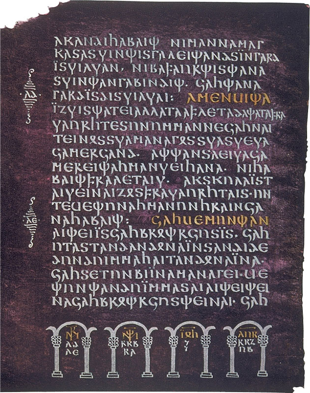 2. Одна из страниц «Серебряного кодекса». Пурпурная окраска пергамента от времени изменила свой цвет, но зато текст, написанный серебряными чернилами, и сегодня виден совершенно отчетливо. Университетская библиотека Уппсалы, Швеция