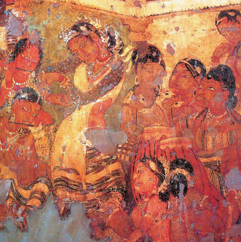 В некоторых древнеиндийских дворцах существовали картинные галереи, а в источниках описываются даже и специальные выставки живописи. До нас дошли от III в. и более позднего времени трактаты о живописи, основывающиеся на более древних текстах и живописной практике, в которых подробно обсуждаются требования к живописцам. Среди них на первых местах стоят умение правильно воспринимать форму видимых предметов и адекватно изображать ее, соблюдение пропорции и масштаба в изображении, необходимость выразительно передавать психологические переживания и эмоции изображаемых персонажей, видеть красоту и грацию в окружающей природе и человеке и воспроизводить их в живописи, стремиться к сходству с натурой. А для всего этого необходимо виртуозно владеть техническим арсеналом живописи. Понятно, что при таком внимании к изобразительному искусству на протяжении многих столетий буддийская живопись достигла высокого уровня художественности, что мы и имеем счастье еще видеть в Аджанте. Исследователи утверждают даже, что здесь она достигла своих высот (а это в основном росписи V–VII вв.) и оказала сильнейшее влияние на буддийскую живопись того времени и последующих столетий во всей Восточной Азии вплоть до Японии. Наиболее известные и качественные росписи находятся в пещерах № 1, 2,16 и 17. Собственно пещерами эти пространства можно назвать только условно, именно потому, что они действительно вырублены в скале. По существу же это интерьерные комплексы, состоящие из храма (чайтья) и большого общего зала, в котором жили монахи (вихара). Именно в вихарах и находятся росписи, ими расписаны потолки и стены. В основном они посвящены историческим или легендарным событиям, описанным в Джатаках, сборниках сказаний о подвигах самого Будды в разных инкарнациях (царя, слона и т. п.) или назидательных рассказов Будды о прошлых существованиях тех или иных людей. Эти сюжеты дали возможность художникам Аджанты проявить необычайную творческую фантазию в изображении жизни древних индусов (в основном знати). Нам открывается череда многофигурных композиций с изображением людей, животных, множества предметов, растений, цветов и бесчисленных орнаментов. Особенно хороши в художественном плане изображения первой пещеры. Здесь множество прекрасных женских образов (небесных апсар, царевен, танцовщиц), образы Бодхисаттв (особенно хорош Бодхисаттва Падмапани, созерцающий цветок лотоса). Выразительны и информативны некоторые сцены из придворной жизни.