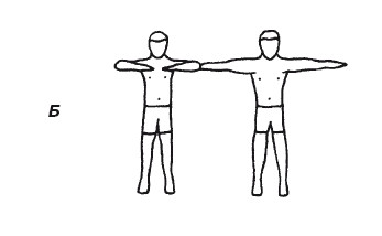 2. Ноги на ширине плеч, руки согнуты в локтях на уровне груди. На счет "раз-два" делай согнутыми руками пружинящие движения назад. На счет "три-четыре" – пружинящие движения назад на этот раз уже прямыми руками (рис. 1, позиция Б).