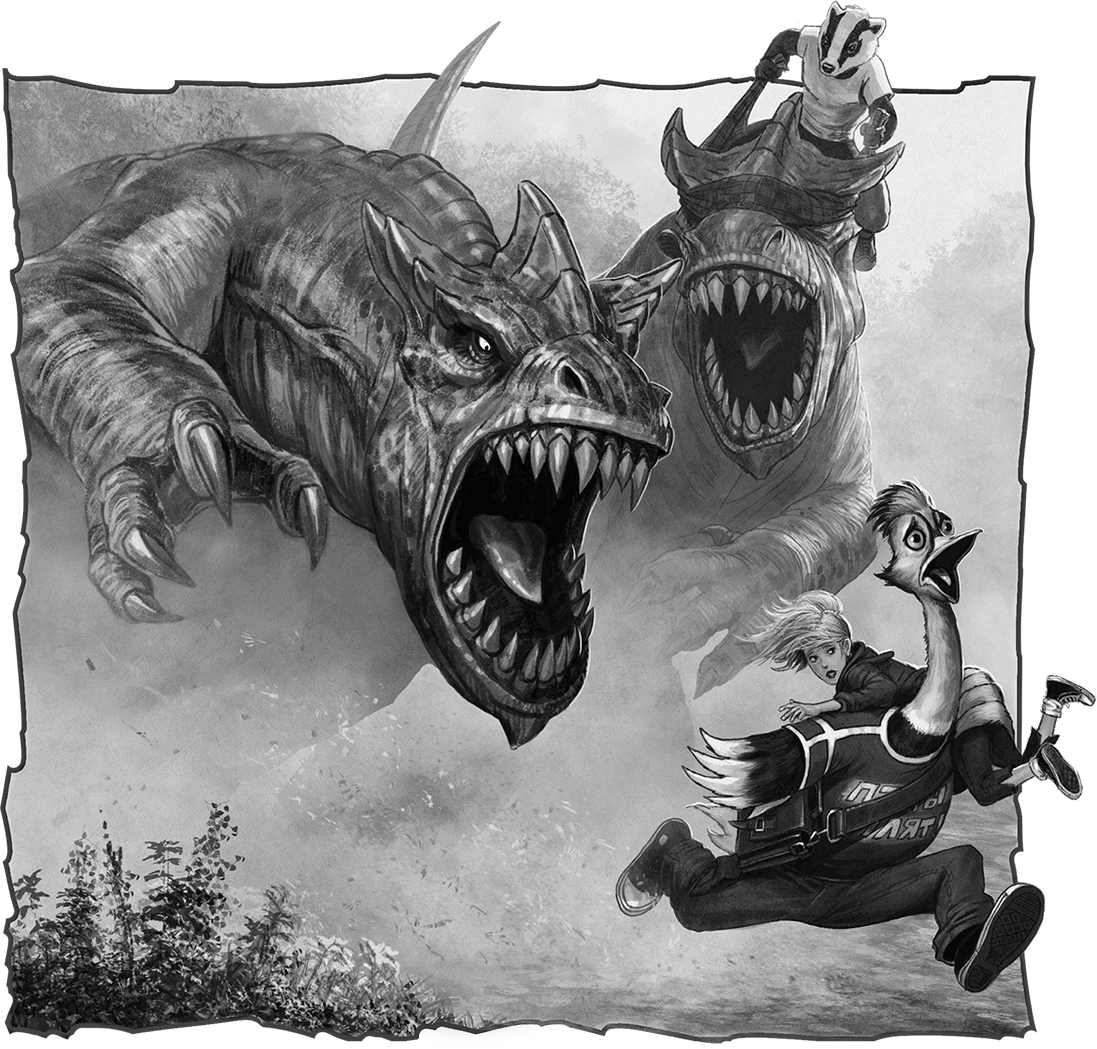 Барсук же, успевший спрыгнуть с ящера перед самым столкновением, вновь толкнул Дикого:
