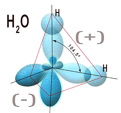 Тем не менее, стало понятно, как образуются ковалентные связи электронов двух атомов водорода с шестью внешними электронами атома кислорода. Ковалентная связь (от лат. со – «совместно» и vales – «имеющий силу») – химическая связь, образованная перекрытием (обобществлением) пары валентных электронных облаков, которые в случае с водородной парой встраиваются в «вакантные» места внешней орбиты электронов атома кислорода. Но не все так просто, как кажется.