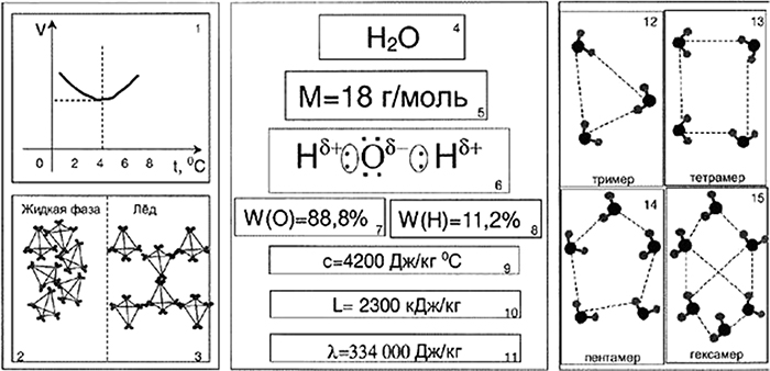 фигура 1 – изменение плотности воды в фазе, определяющей вообще возможность жизни на Земле. Фигуры 2, 3, 12-15 расположение молекул воды в различных состояниях. Фигура 4 – химическая формула, 6 – молекулярный вес, 6 – схематичная формула строения молекулы воды, 7-8 – относительный состав молекулярных масс кислорода и водорода, Фигура 9 – Удельная теплоемкость – около 4200 (Дж/кг. °С)).