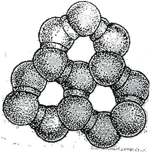 И доказательством этому может служить представленная, и до сих пор всё ещё «гипотетическая», схема структуры молекулы воды. Дело в том, что электроны не сосредоточены в одной точке, а «размазываются» по орбите в виде электронного облака. Орбиты электронов двух атомов водорода и двух внутренних электронов атома кислорода – шарообразны, а шесть других внешних электронов кислорода имеют сложную орбиту в форме объёмной восьмерки, направленной по трем координатным осям.