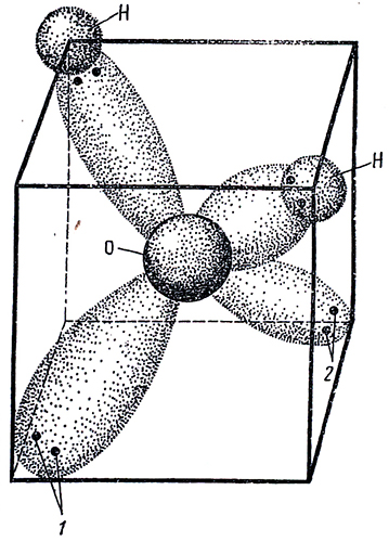 Рис. 3. Электронная модель молекулы Н2О. восемь электронов попарно вращаются по четырем орбиталям, расположенным в трех плоскостях (углы 900), вписывающихся в куб. 1, 2 – неопределенные пары электронов [15].
