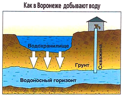 Что из себя представляют эти водозаборы? По схеме видно, что в водоносный горизонт просачивается всё, что накопилось в водохранилище за многие годы его существования. Но это ещё полбеды!