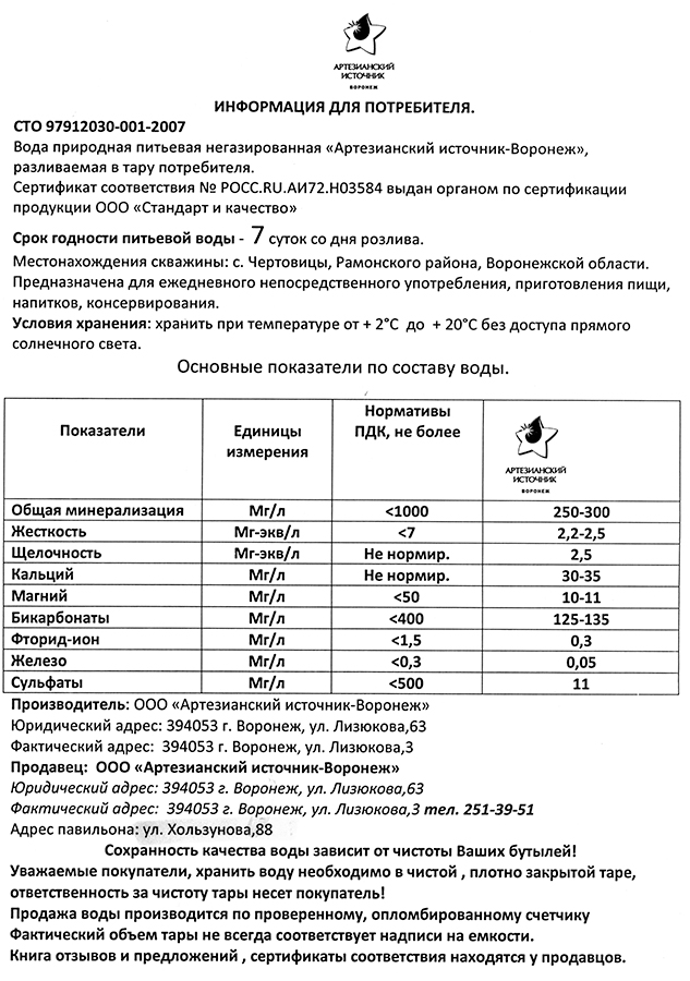 АРТЕЗИАНСКИЙ ИСТОЧНИК Вода природная питьевая, негазированная. Производитель: ООО «Артезианский источник – Воронеж». 394053 г. Воронеж, ул. Владимира Невского д. 38/2. Местонахождение источника: Скважина № 1П/07 с. Чертовицы, Рамонского района, Воронежской области. Общая минерализация – не более 300 мг/л. Общая жесткость – 2,5 мг-экв/л. Содержание активных катионов и анионов: Са – не менее 30 мг/л; Mg – не менее 10 мг/л. Рекомендуемый срок годности – 7 суток Условия хранения: Хранить при температуре +2 – +200С. СТО 97912038-001-2008 и 97912038-002-2015.
