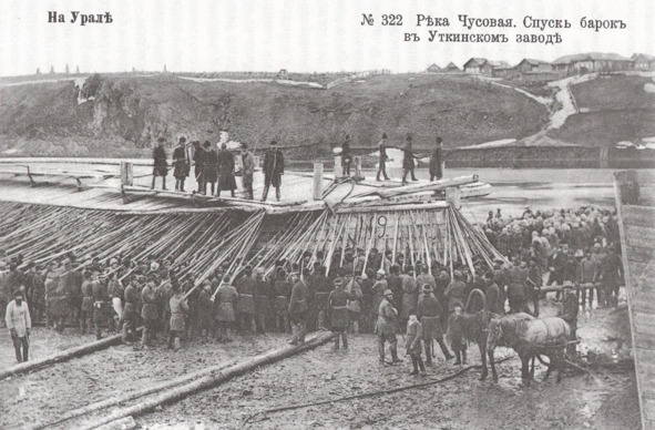 барками (то есть большими грузовыми беспалубными плоско‐ донными судами) по Чусовой. К 1760 году завод производил до 111 тыс. пудов чугуна в год. К Уткинскому заводу относились и обширная, простиравшаяся на шестьдесят верст вокруг него лесная дача и обширный в семь с половиной верст длиной пруд, ис‐ пользовавшийся для обеспечения «подливных» заводских фабрик.
