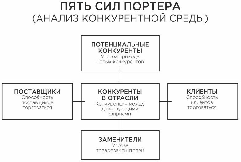 Анализ по пяти силам, обозначенным М. Портером, подразумевает анализ угрозы появления продуктов-заменителей, анализ угрозы появления новых игроков, анализ рыночной власти поставщиков, анализ рыночной власти потребителей, анализ уровня конкурентной борьбы.