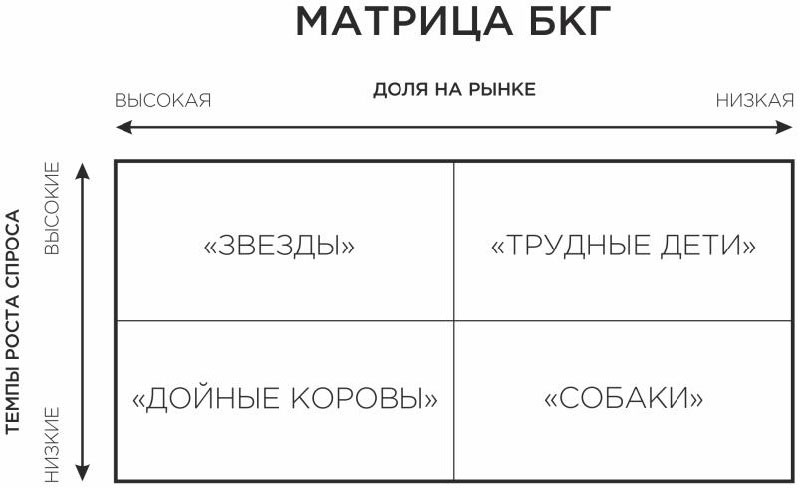 Матрица включает четыре квадранта, объединяющих конечные значения показателей по осям (низкий темп роста – большая доля, высокий темп роста – большая доля, низкий темп роста – малая доля, высокий темп роста – малая доля).
