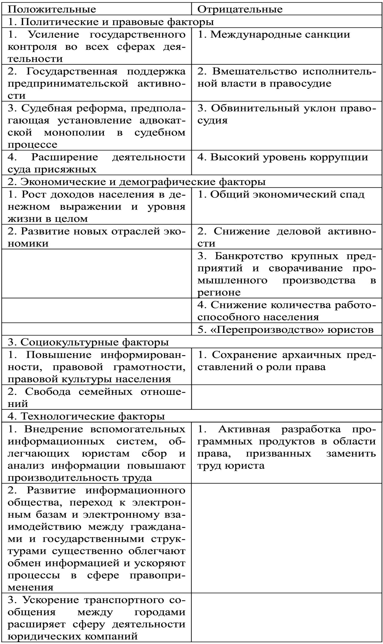 Таблица № 2. Влияние факторов внешней среды на адвокатское бюро