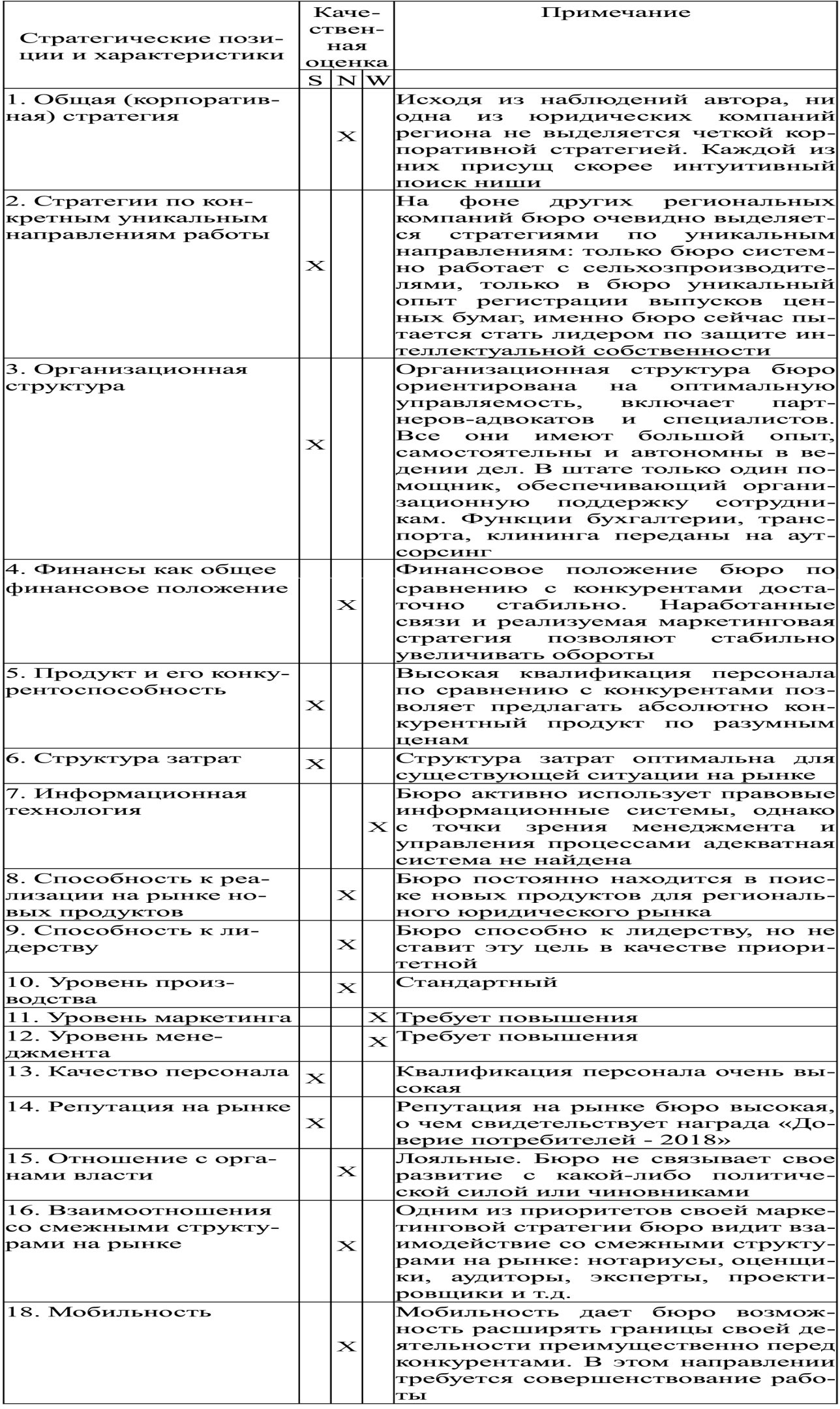 Обобщая выводы по анализу внутренней среды адвокатского бюро, отметим его сильные стороны. К ним, прежде всего, отнесем сложившуюся репутацию на региональном рынке юридических услуг (более 70 % новых поручений в адвокатское бюро поступает от доверителей, обратившихся по рекомендации своих партнеров или знакомых, опросы показывают, что, например, в среде руководителей сельскохозяйственных предприятий узнаваемость бренда составляет более 60 %); двадцатилетний опыт работы на рынке юридических услуг; широкий спектр предлагаемых юридических услуг; высокая квалификация сотрудников (более половины сотрудников адвокатского бюро окончили аспирантуру, партнеры имеют ученые степени, средний юридический стаж сотрудника – 13,5 лет); достаточная численность штата для выполнения любого поручения в срок (в производстве сотрудника постоянно находится в среднем 7-10 поручений, средняя продолжительность подготовки документа для доверителя 1–2 дня); мобильность (располагая собственным транспортом, специалисты при необходимости могут оперативно выезжать к доверителям); эффективность (большая доля дел заканчивается успехом (внутренний статистический учет показывает, что порядка 92 % принятых к производству адвокатским бюро дел заканчивается для доверителя успешно); наличие уникальных направлений, которые не затронуты конкурентами (например, регистрация выпусков ценных бумаг, реорганизация сельскохозяйственных кооперативов); разумное ценообразование на основе рекомендованных ставок, утвержденных Адвокатской палатой Владимирской области; ведение дел любой сложности.